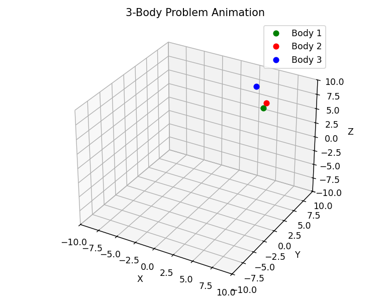 A minimal yet interactive 3-body gravitational simulation in Python. Visualizes chaotic orbital motion in 3D with smooth animation and configurable parameters. Exports both MP4 animations and CSV trajectory data for analysis. Perfect for learning orbital dynamics and experimenting with physics setups.