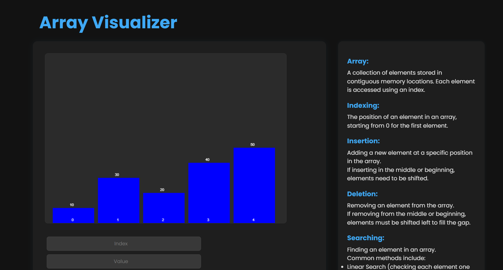BitbyBit is an interactive tool designed to help users understand how arrays,stacks,queues work by providing real-time visual representations of operations. It allows users to input values, perform sorting, searching, and other modifications while visually observing changes in the array. This makes complex algorithms like Linear Search, Binary Search easier to grasp. click here