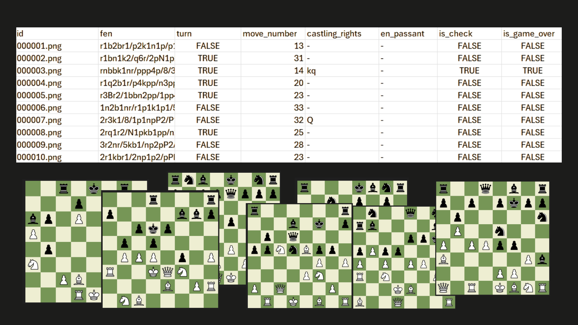 Chess Dataset Generator creates chess images with corresponding metadata. It uses python-chess to sample legal positions and CSV for structured metadata storage. Configurable options include resolution, board size, and piece sprites.