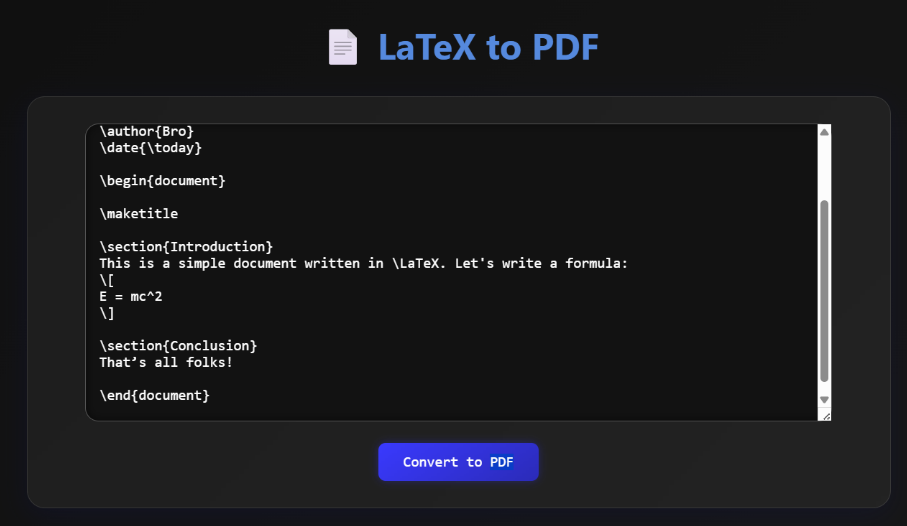 A LaTeX converter that takes LaTeX code like math equations or solutions and compiles it into a clean PDF using pdflatex. It’s designed for fast and accurate rendering of mathematical content. Just copy LaTeX output, feed it to the converter, and get a ready-to-share PDF instantly. Great for assignments, notes, and quick document generation.