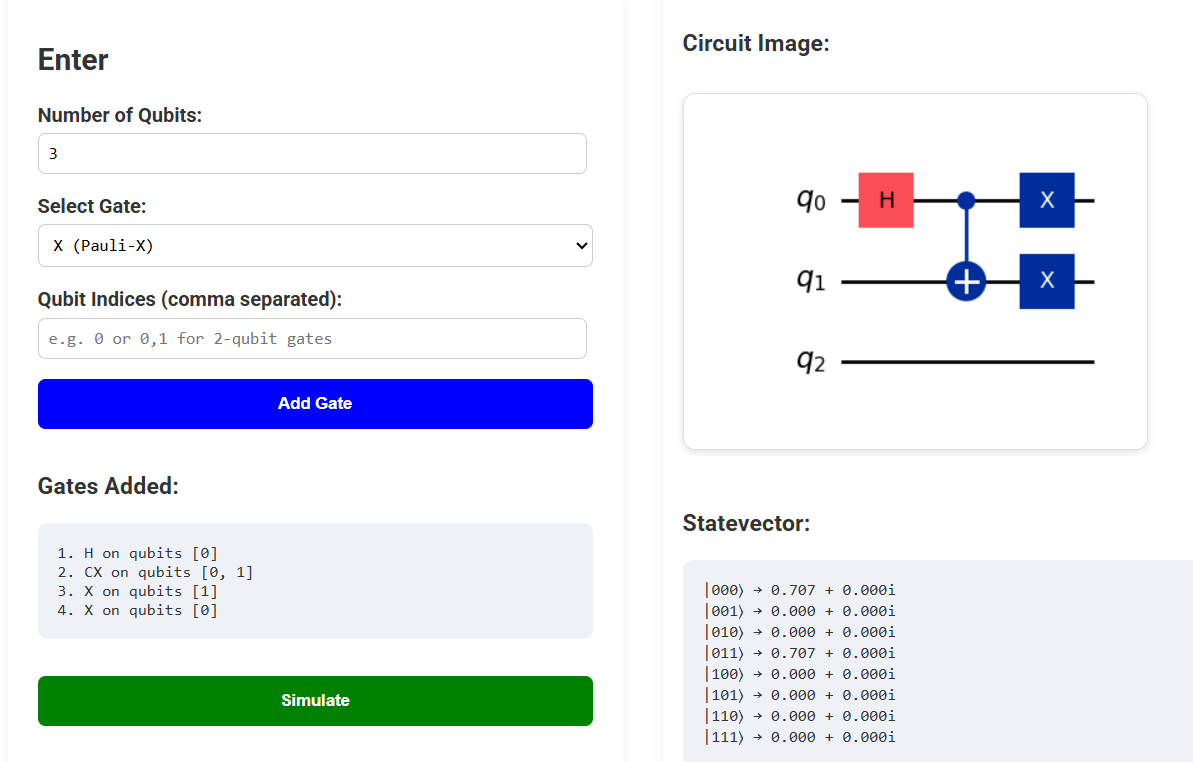 An interactive quantum circuit simualator built using qiskit(python) for backend computation and react for frontend ui. it visualizes gate operations, live state vectors and measurement probabilites in real time across multiple qubits